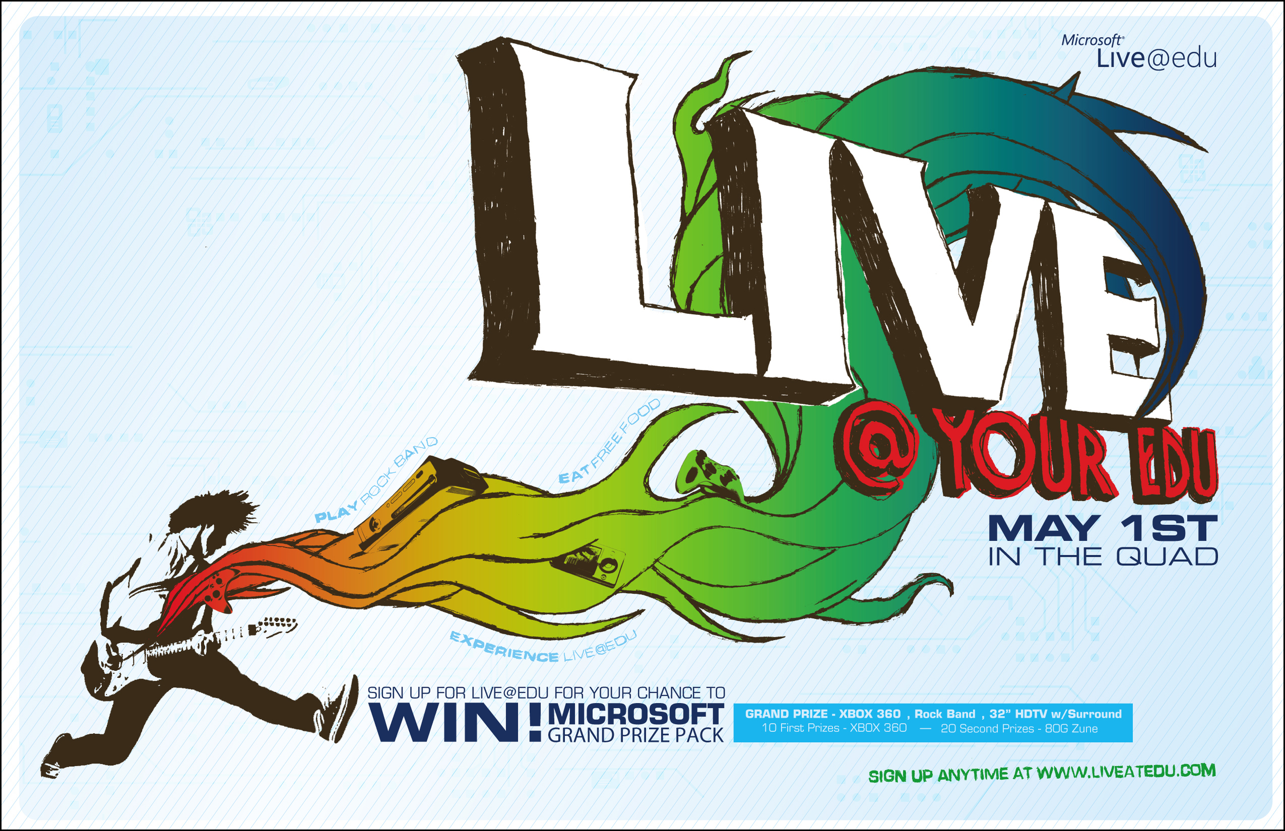 These posters were designed to create awareness on college campus's of our activation events. The events were held on college campus's to drive awareness of the students .edu email accounts and to encourage the to start using them. This mundane subject was disguised as a on campus event with free food and the game Rock Band. Students that got involved also had a chance to win a Xbox, TV or MP3 player.
